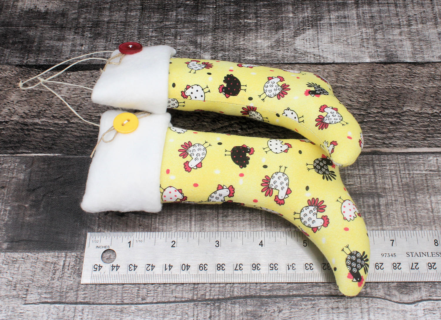Add to the holiday fun with these 6-1/4" stocking ornaments made with cotton print fabric with cute little chickens on a yellow background and fleece cuffs. Adorned with buttons and twine bows. Versatile for trees, pegs, bowls, or baskets. Handmade in USA.