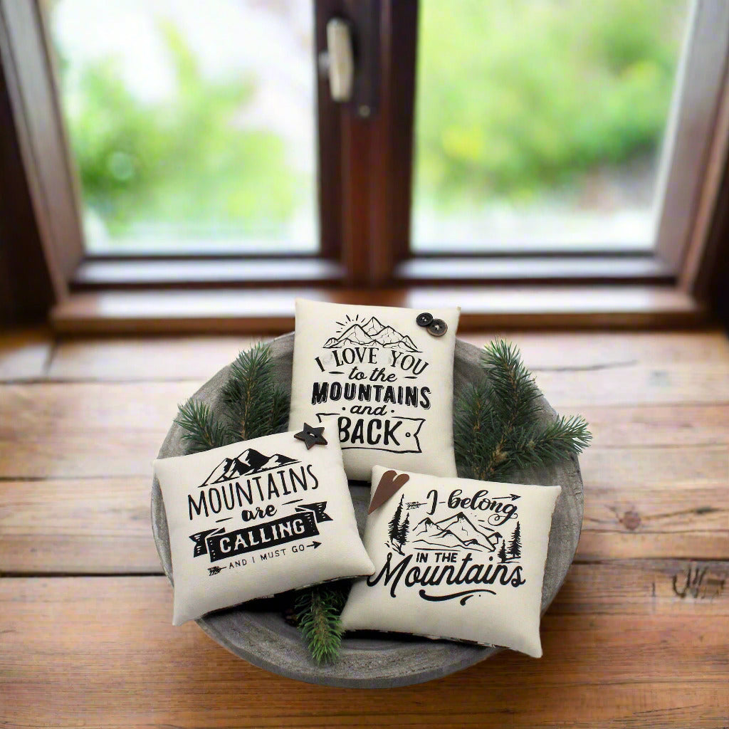Set of three mini mountain adventure-themed pillows perfect for rustic cabin decor. Screen printed on cream cotton, approximately 4.5" x 5.5". Permanent, water-safe design with woodsy-themed backing. Handmade in USA, ready to ship. Let your imagination wander!